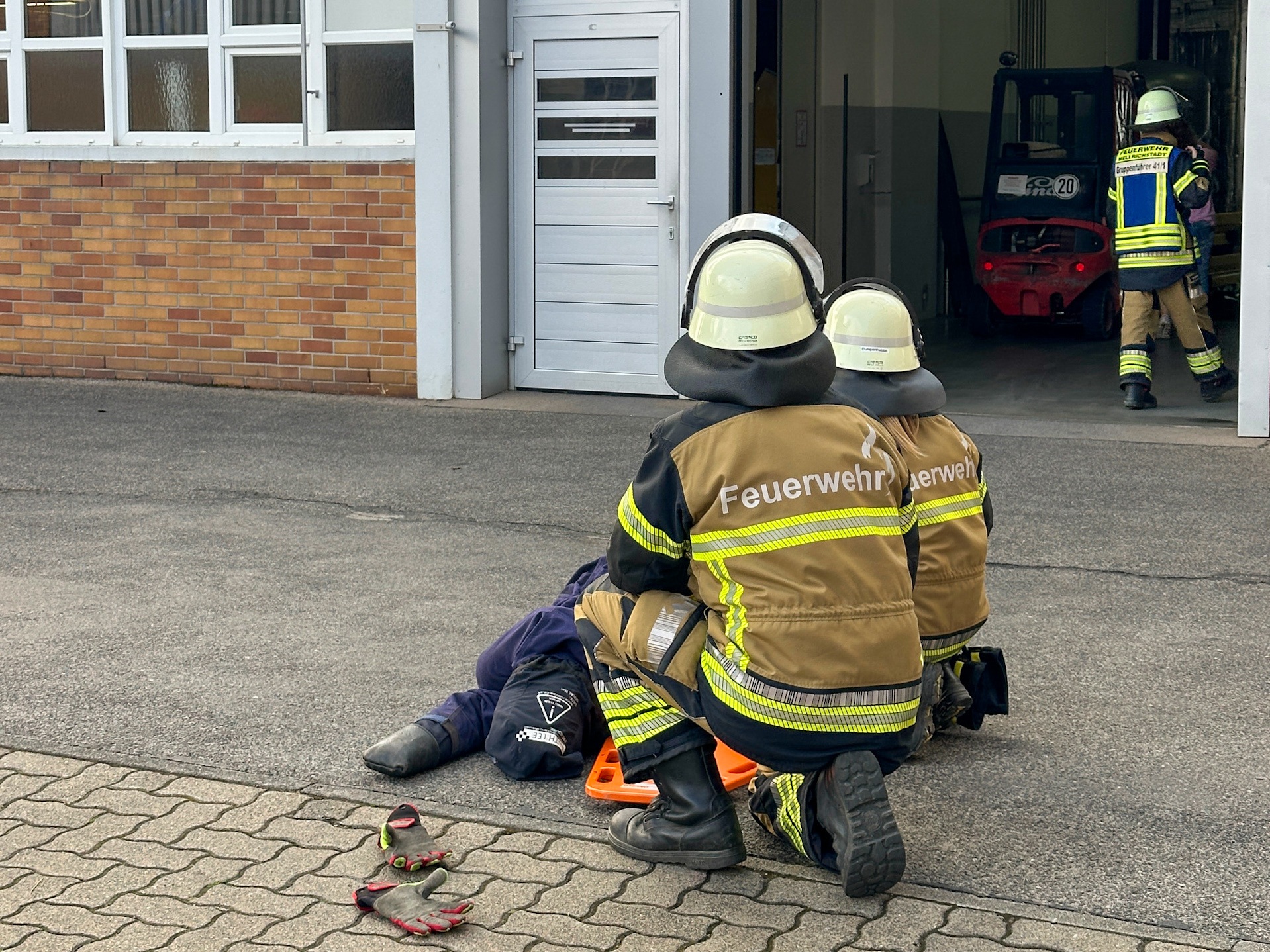 Angenommen wurde ein Unfall im betrieblichen Umfeld – eine Person war unter einem Gabelstapler eingeklemmt. Nach der Erkundung wurde das Fahrzeug gesichert, Gefahrenstellen beseitigt und die verletzten Personen fachgerecht gerettet.