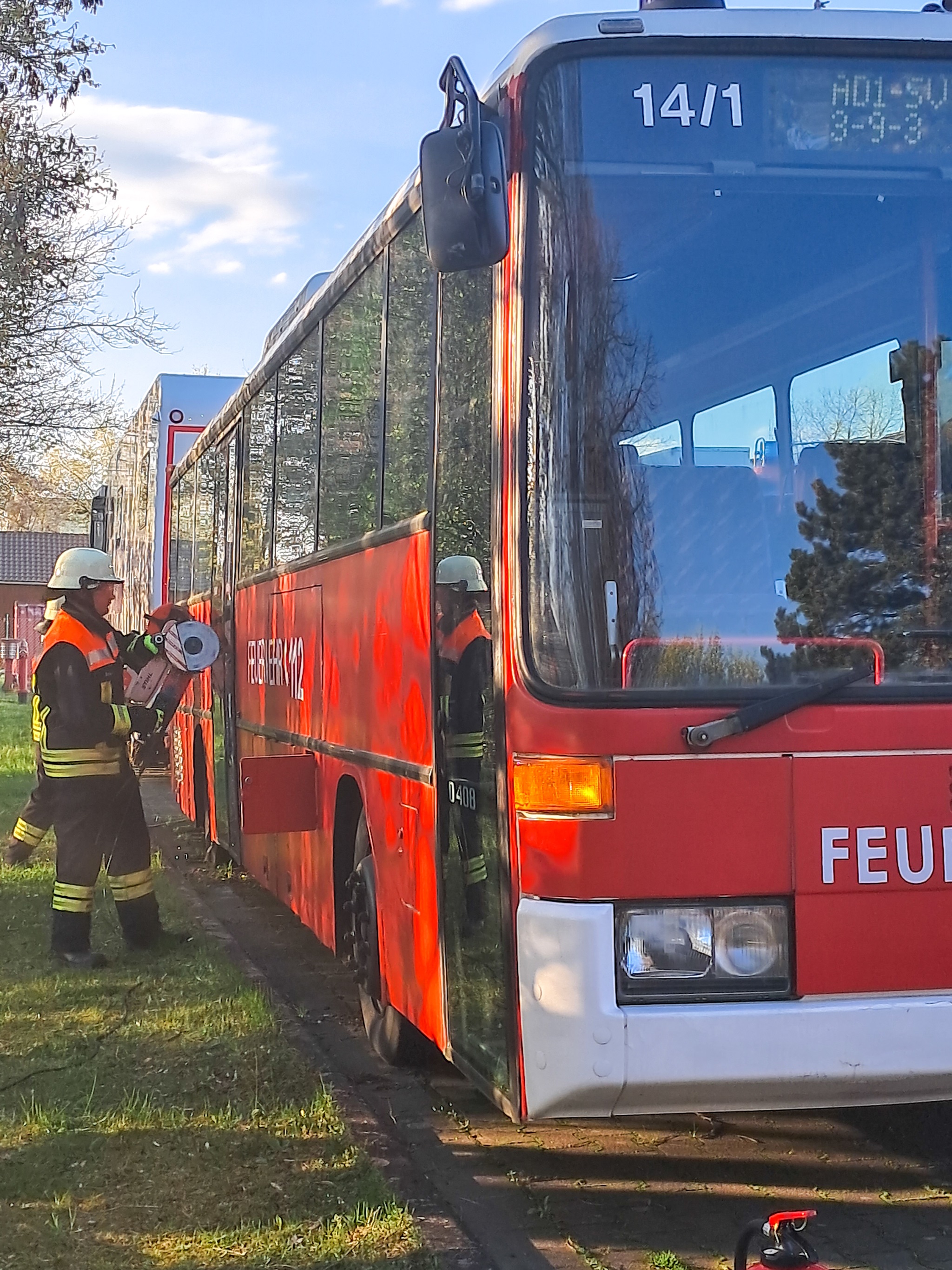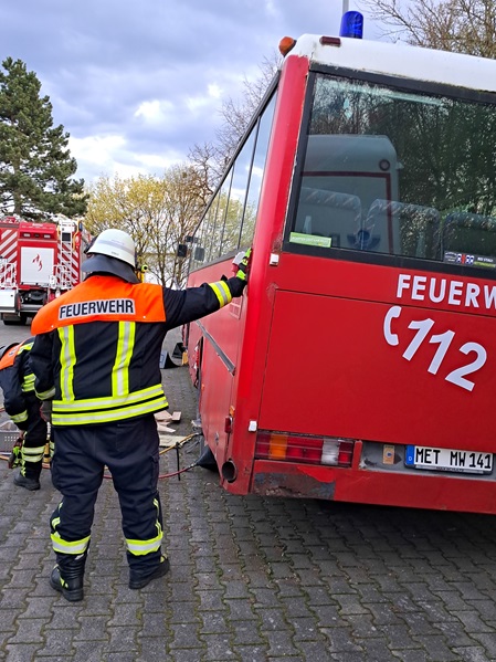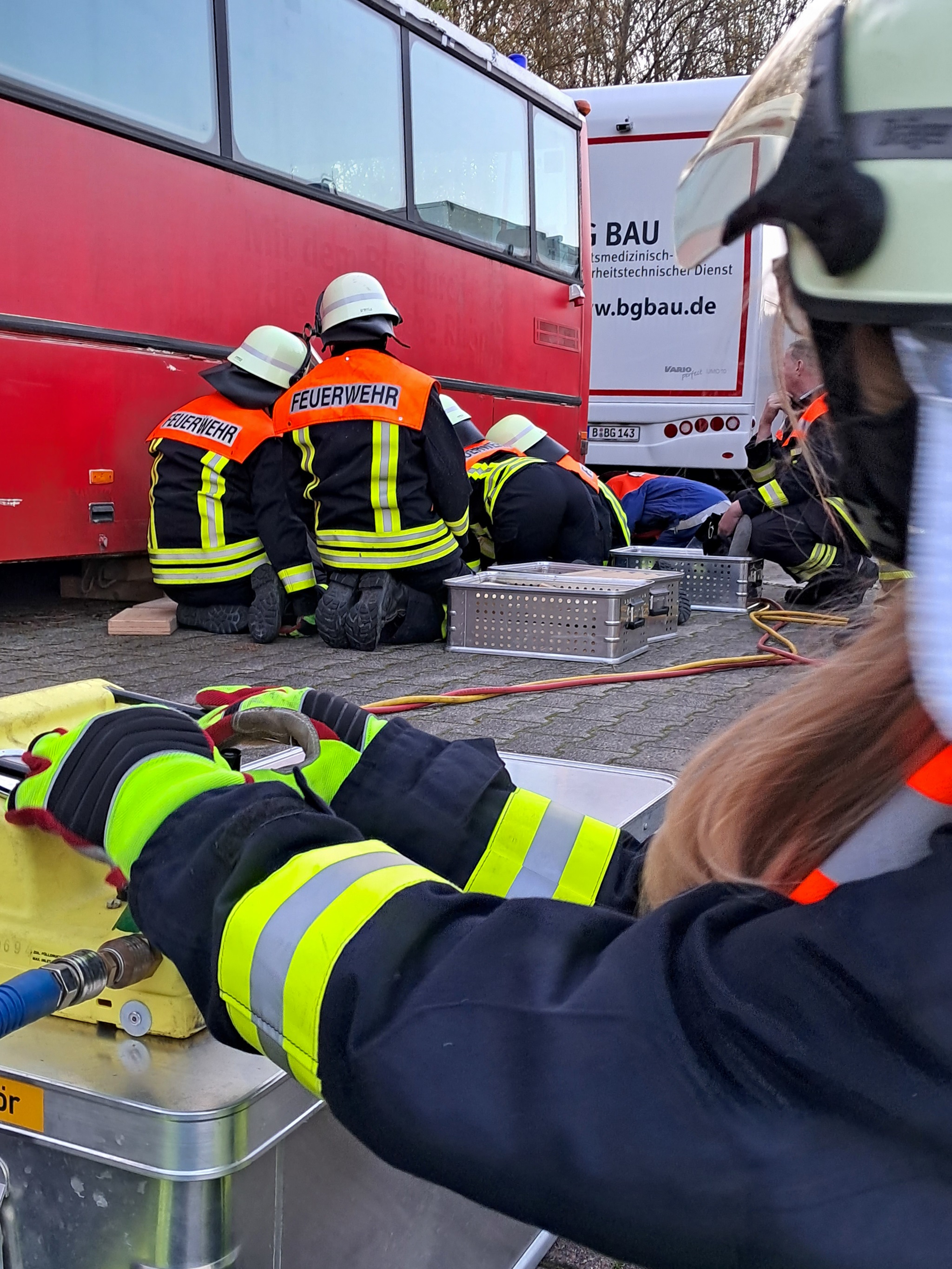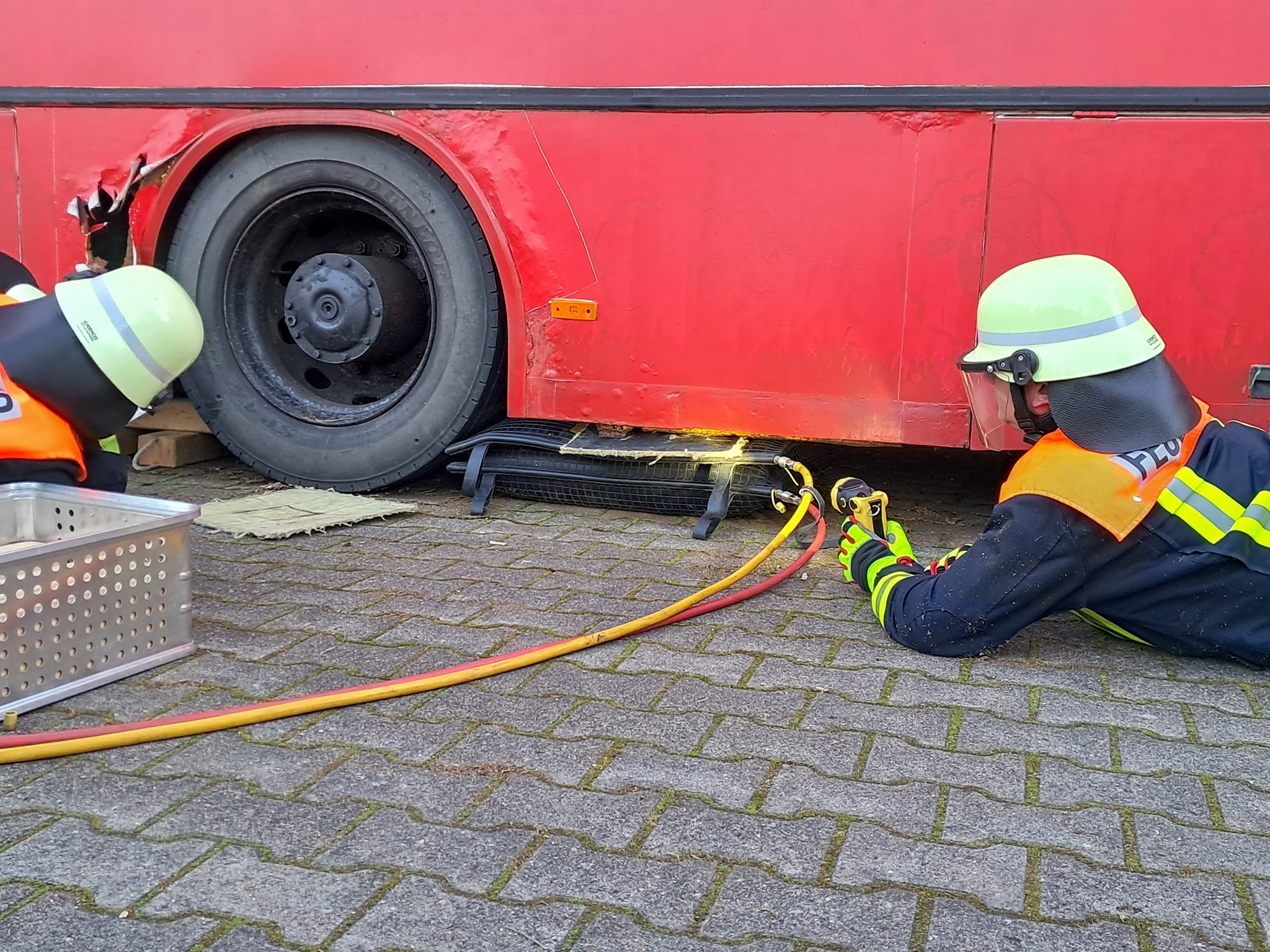 Hierzu übten unsere Kameradinnen und Kameraden die Bedienung von Trennschleifer, Flex und Hebekissen an einem ausrangierten Bus vom Omnibus Service Mellrichstadt