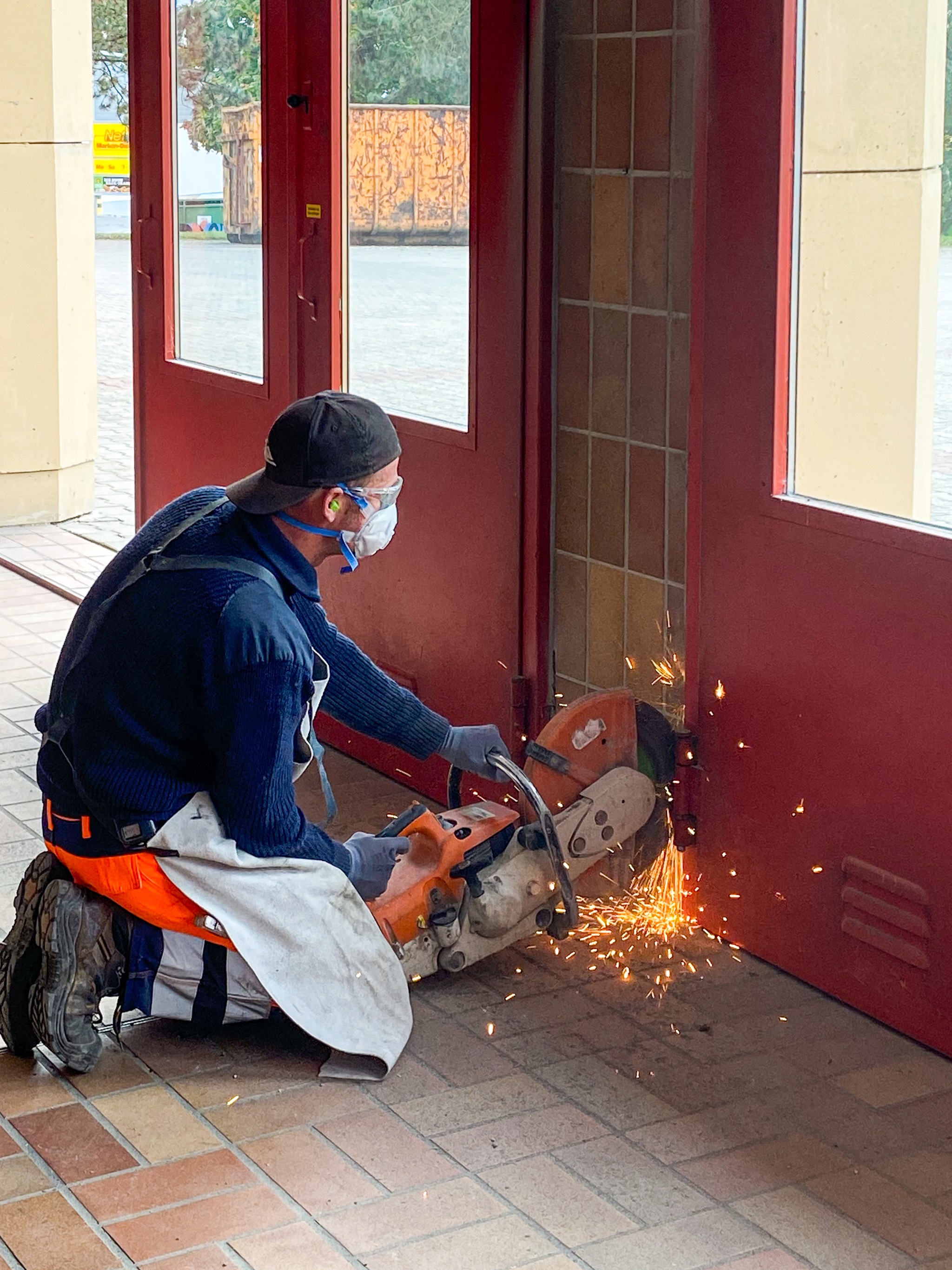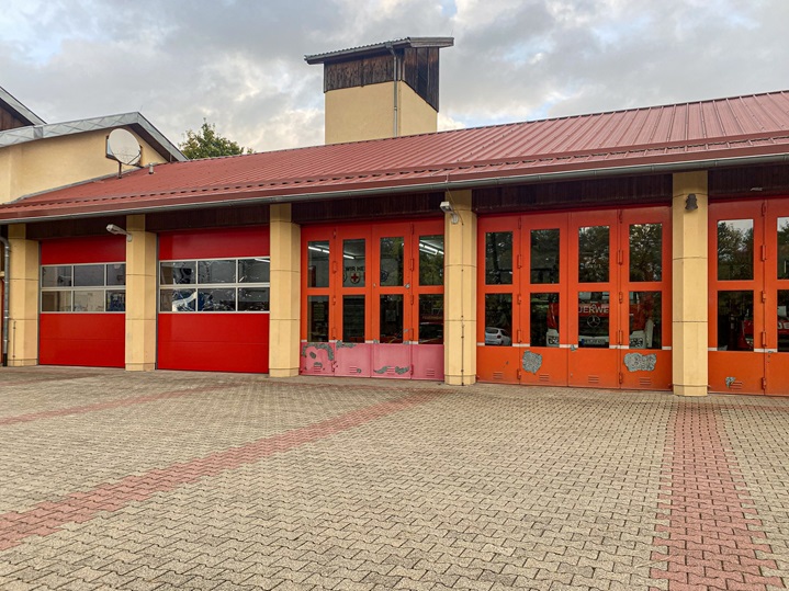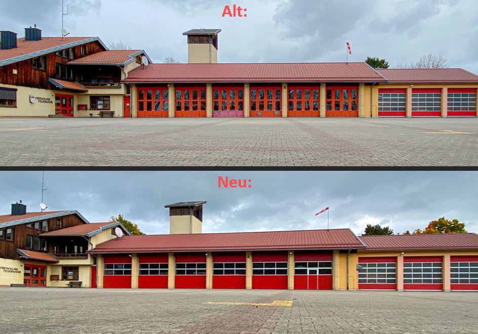 Insgesamt wurden 9 Hallentore ausgetauscht, wobei 3 Tore vom Anbau (rechts) erhalten blieben. Nicht zu sehen ist die Waschhalle, das Öllager und die Werkstatthalle.
