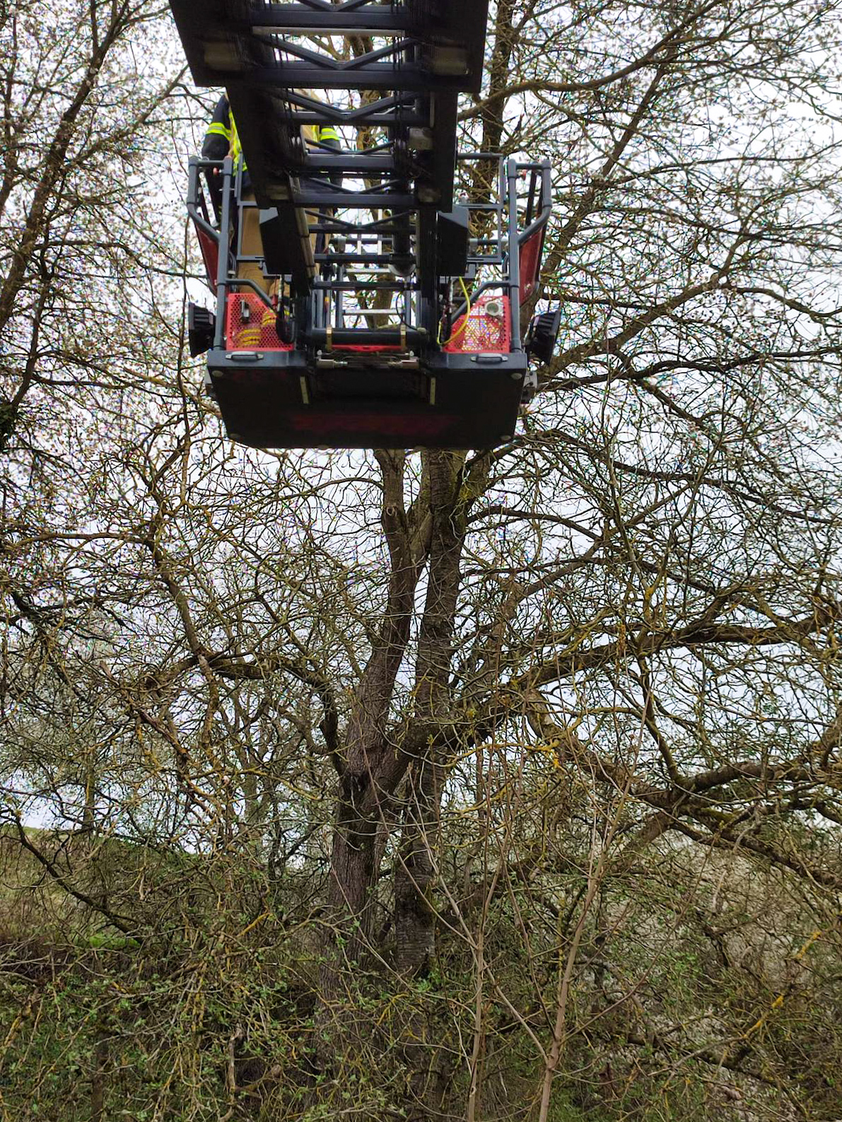 Gemeldet wurde uns eine Katze auf einem Baum. Wir erkundeten die Örtlichkeit und retteten das Tier anschließend mit der Drehleiter.