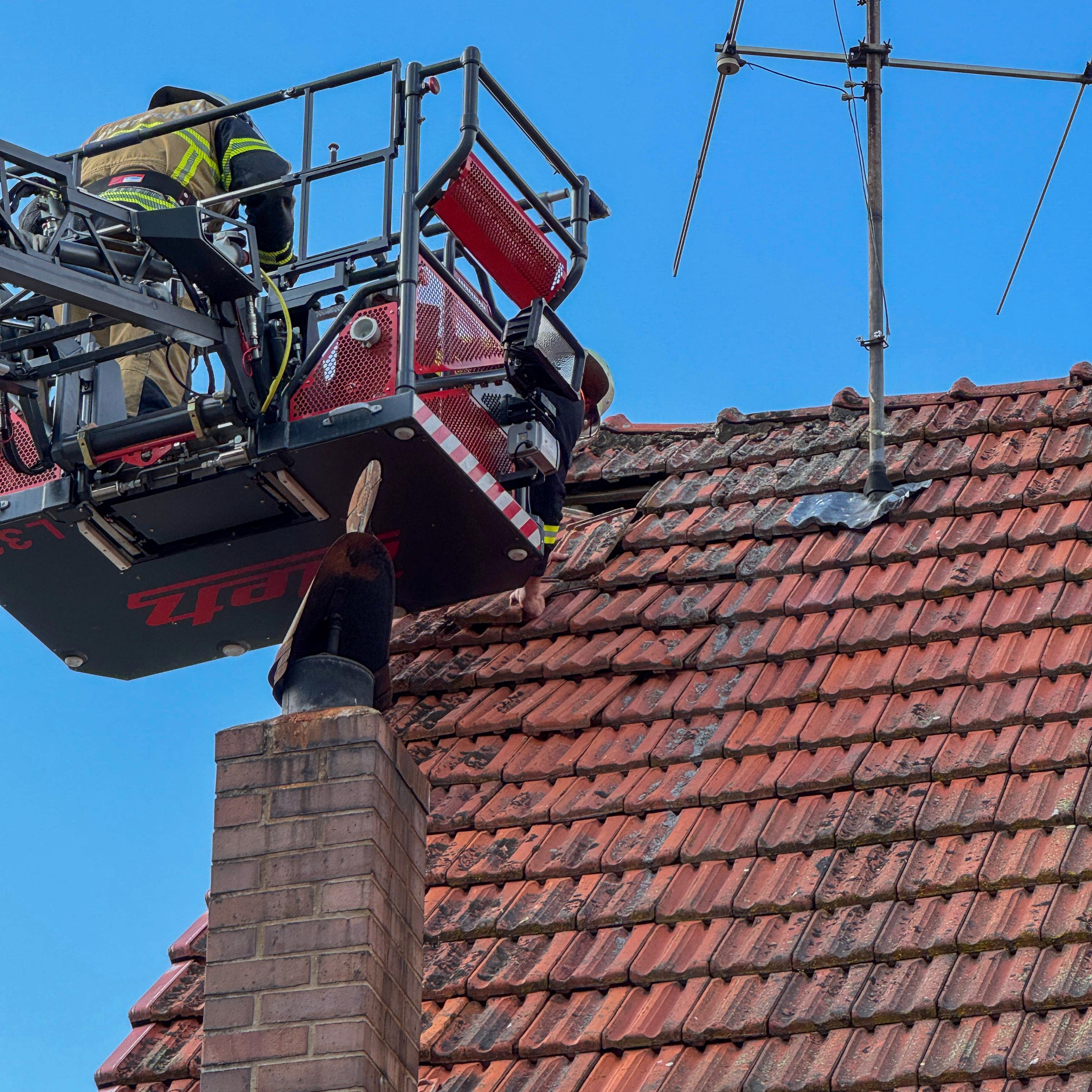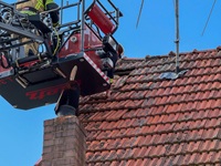Wegen umherfliegenden Dachziegeln wurden wir nach Unterelsbach alarmiert. Wir sicherten das Gebäude und entfernten lose Ziegel.