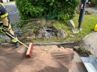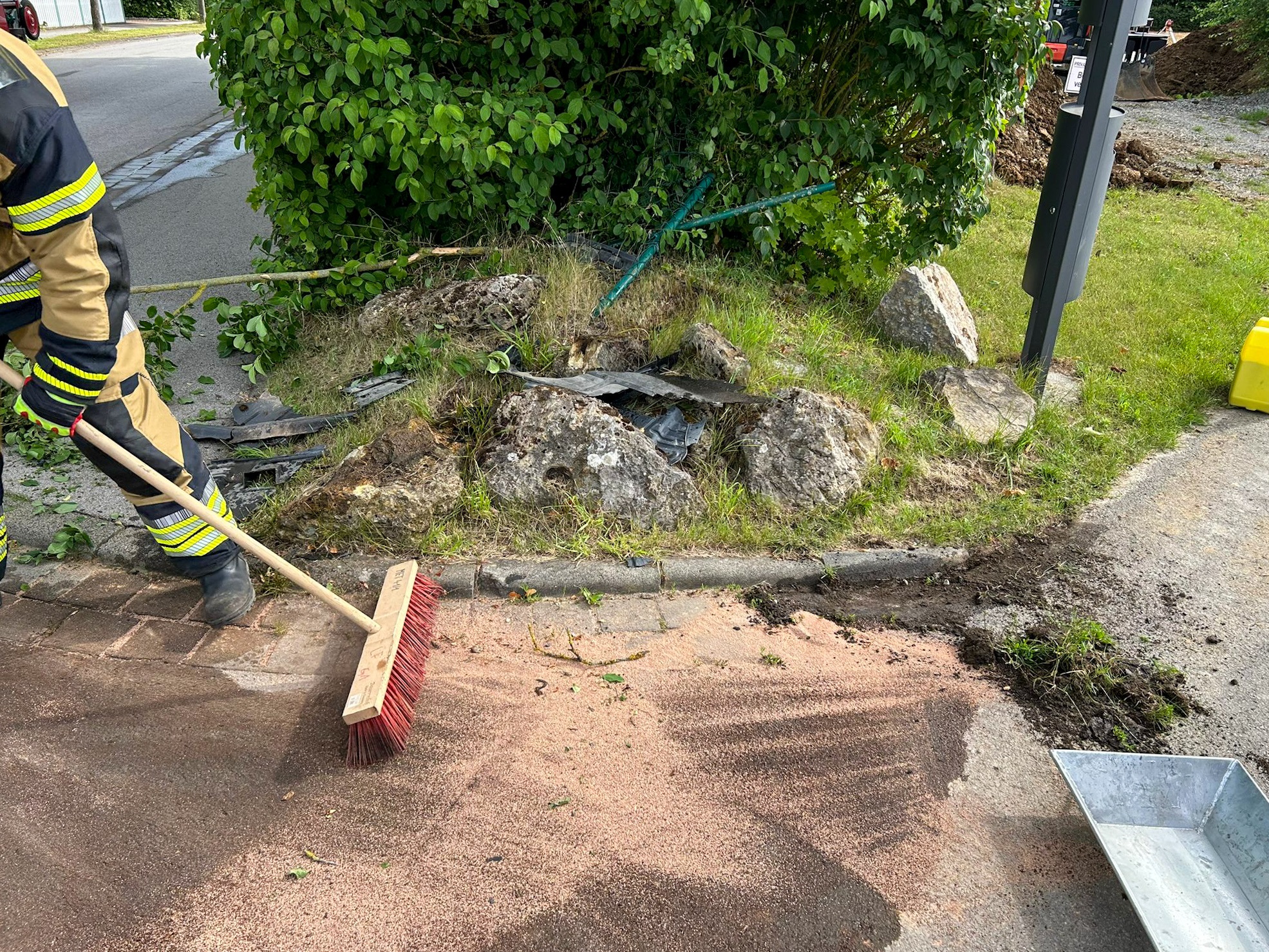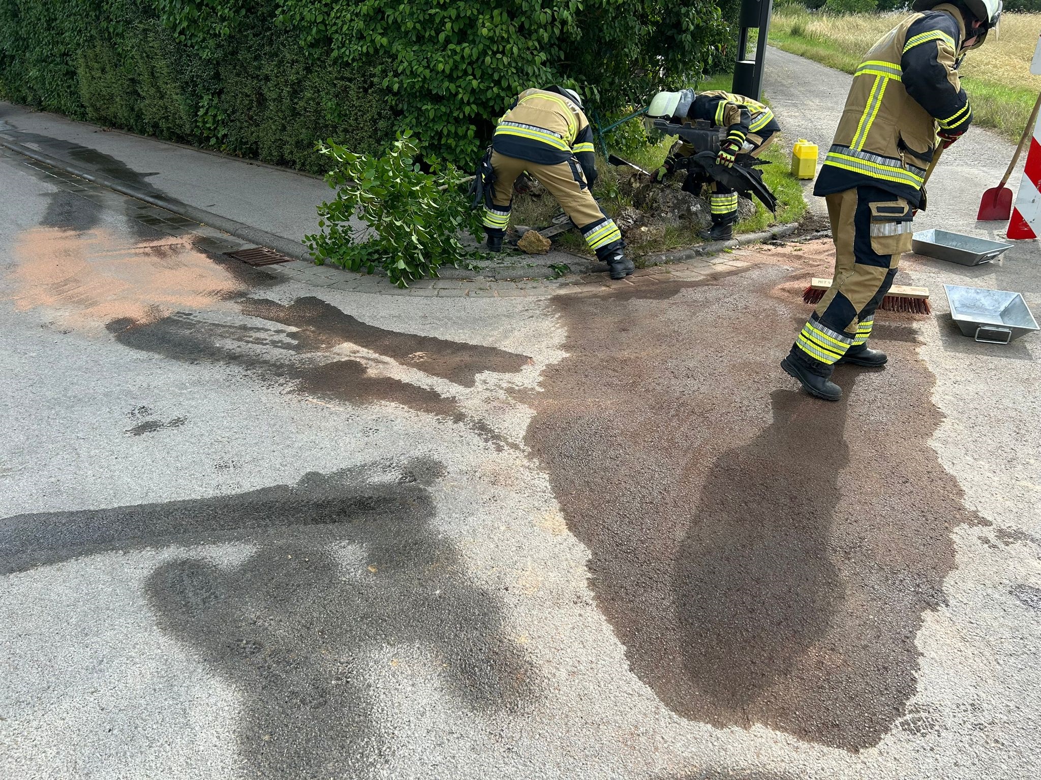 Nach einem Verkehrsunfall liefen Betriebsstoffe aus. Wir banden diese ab und reinigten die Straße.