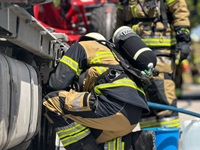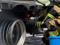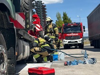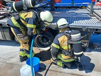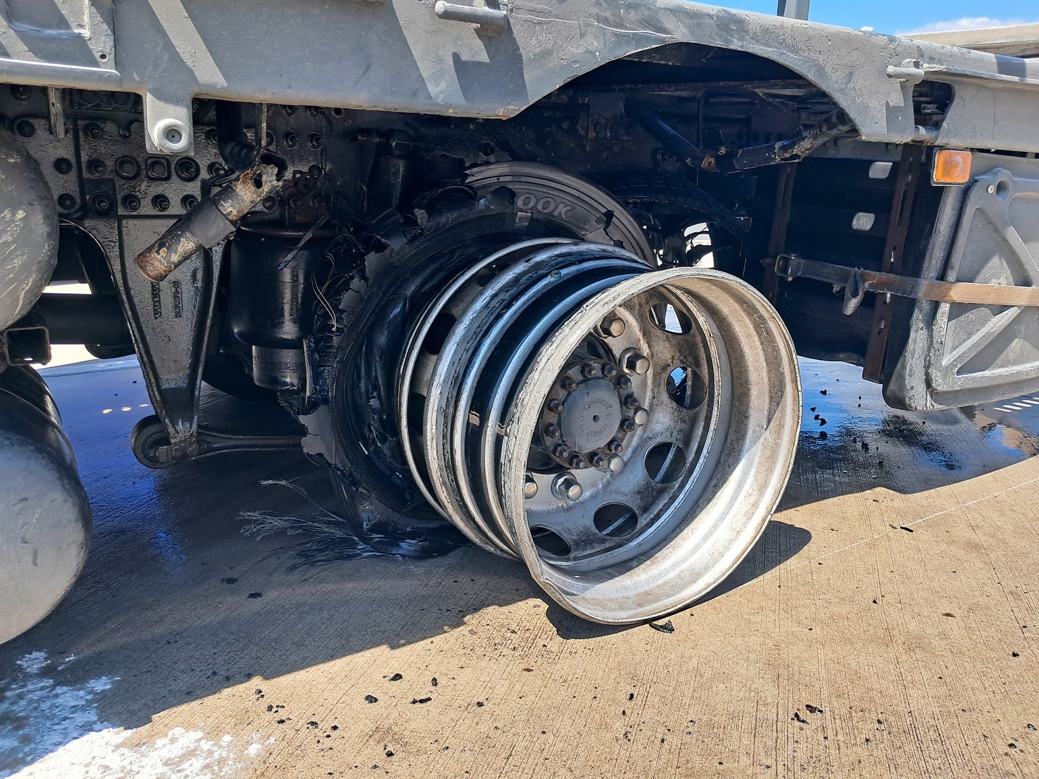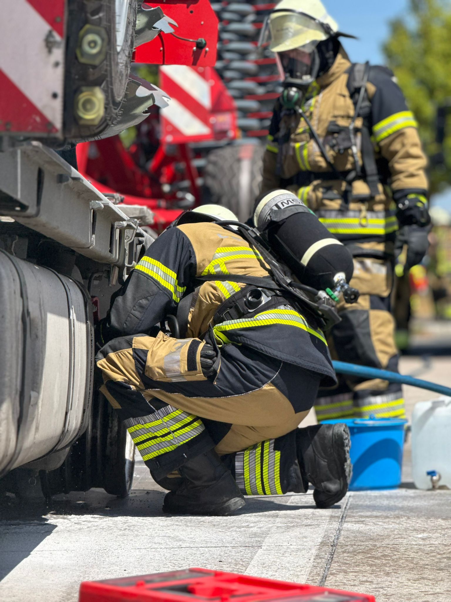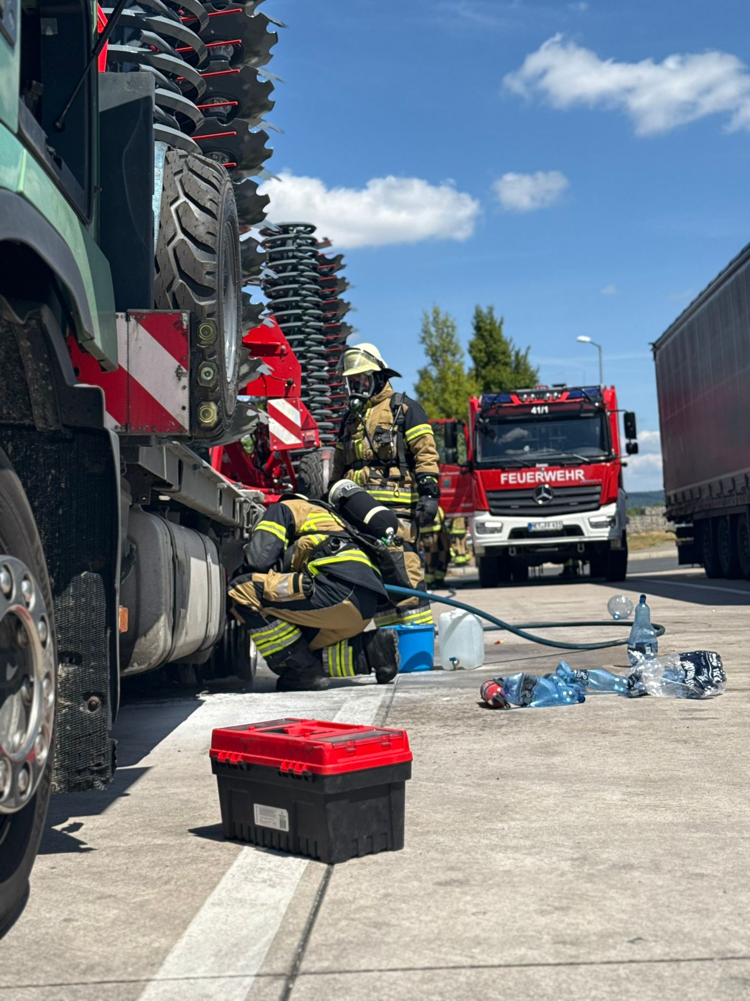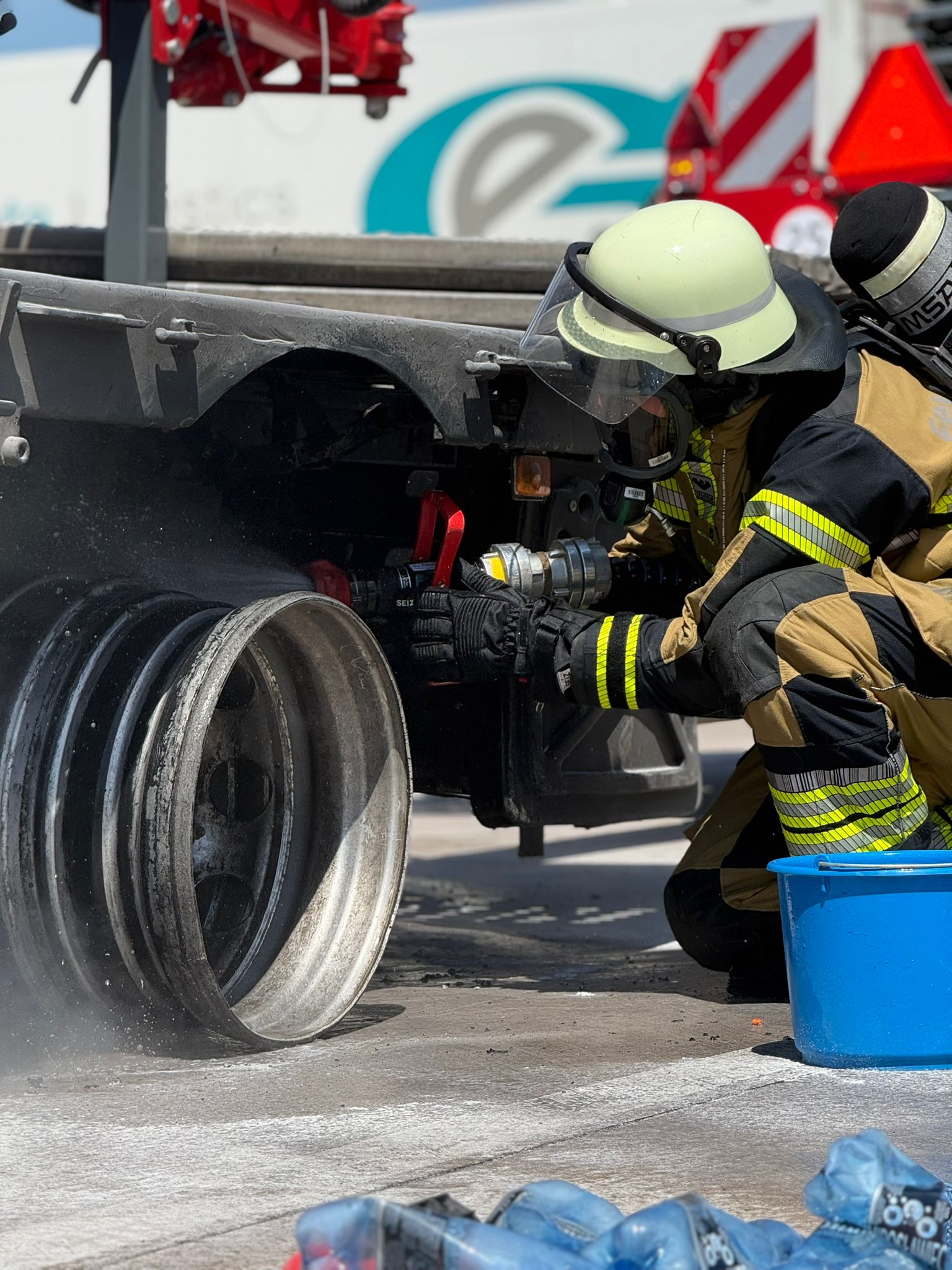 Nach einem Reifenplatzer auf der Autobahn rettete sich der Fahrer noch in eine Parkbucht der Raststätte. Dort versuchten mehrere Personen den qualmenden Reifen mit Wasserflaschen und -Kanistern zu löschen. Ein Trupp rüstete sich mit Atemschutz und dem Schnellangriff aus und kühlte den Bereich.