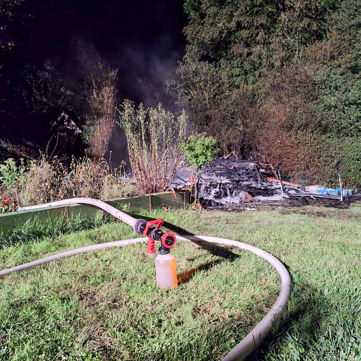 Wir wurden nachalarmiert, um bei einem Gartenhüttenbrand zu unterstützen. Die eingetroffenen Feuerwehren hatten bereits mit der Brandbekämpfung begonnen und wir stellten mit unserem Tanklöschfahrzeug die Wasserversorgung sicher. Es wurden keine Personen verletzt.