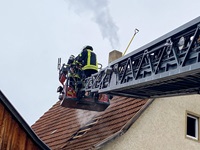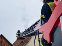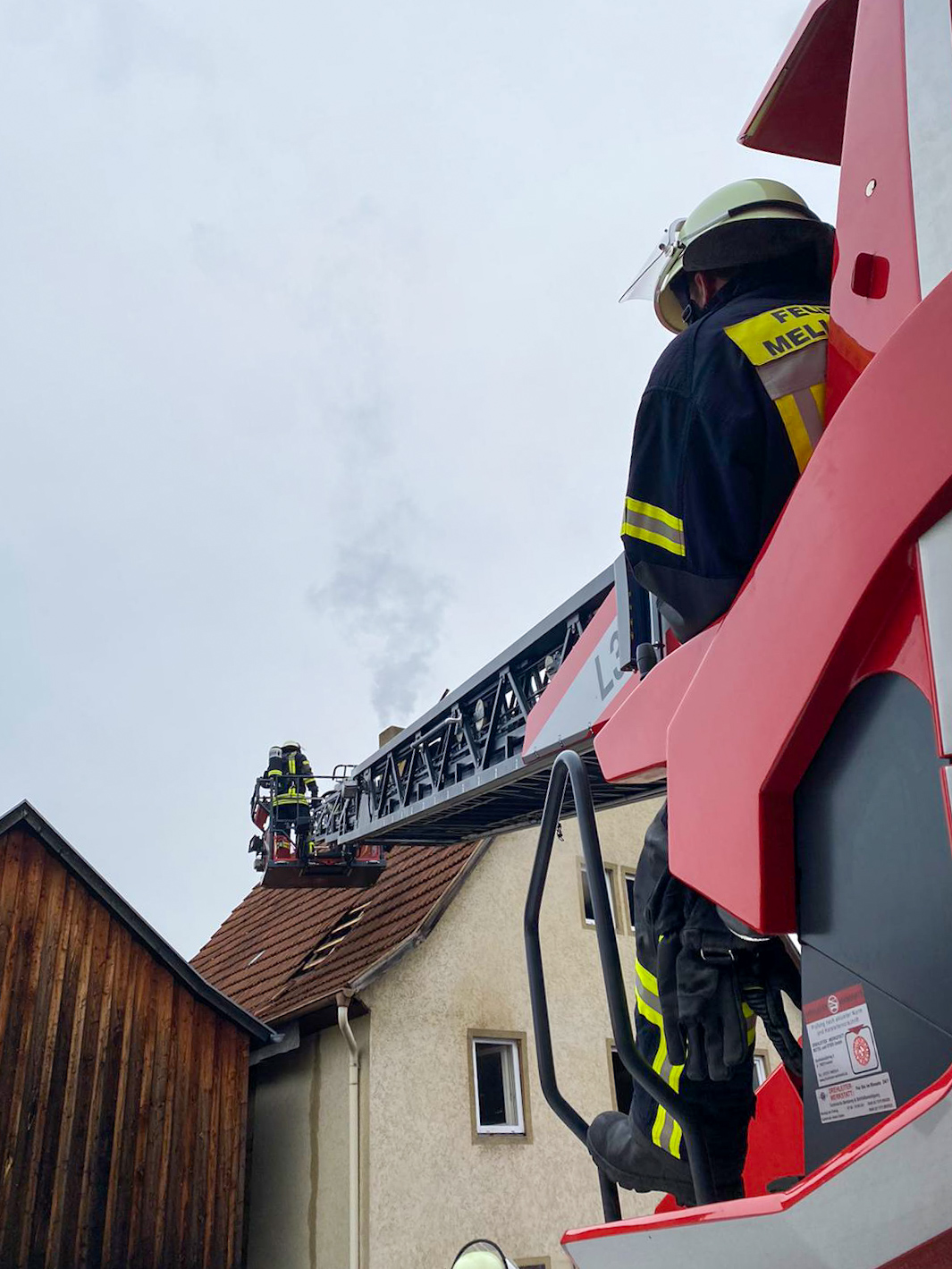 Trupps der örtlichen Feuerwehren begaben sich in den Innenangriff, während wir unsere Leiter in Position brachten. Die Wasserversorgung wurde durch unser Tanklöschfahrzeug sichergestellt. Wir waren mit der Drehleiter aktiv auf dem Hausdach und öffneten in Absprache mit der Einsatzleitung die Dachhaut. Nachdem wir uns ein erstes Bild von oben verschafften, entfernten wir einzelne Ziegel. Nach ca. einer Stunde war der Einsatz für unsere Kräfte beendet. Es wurden keine Personen verletzt.