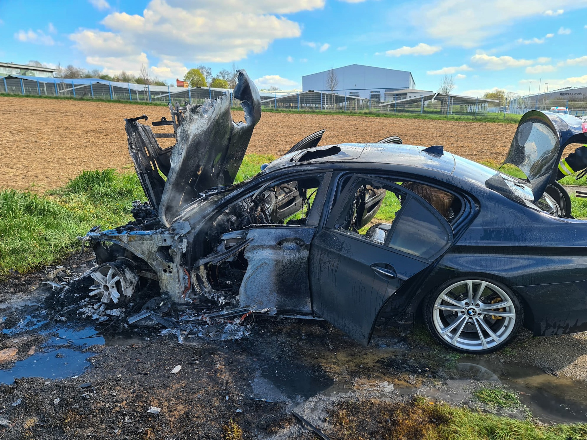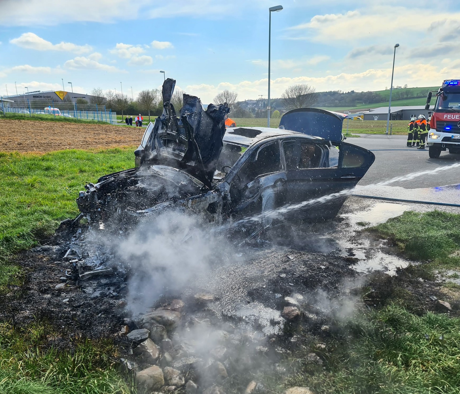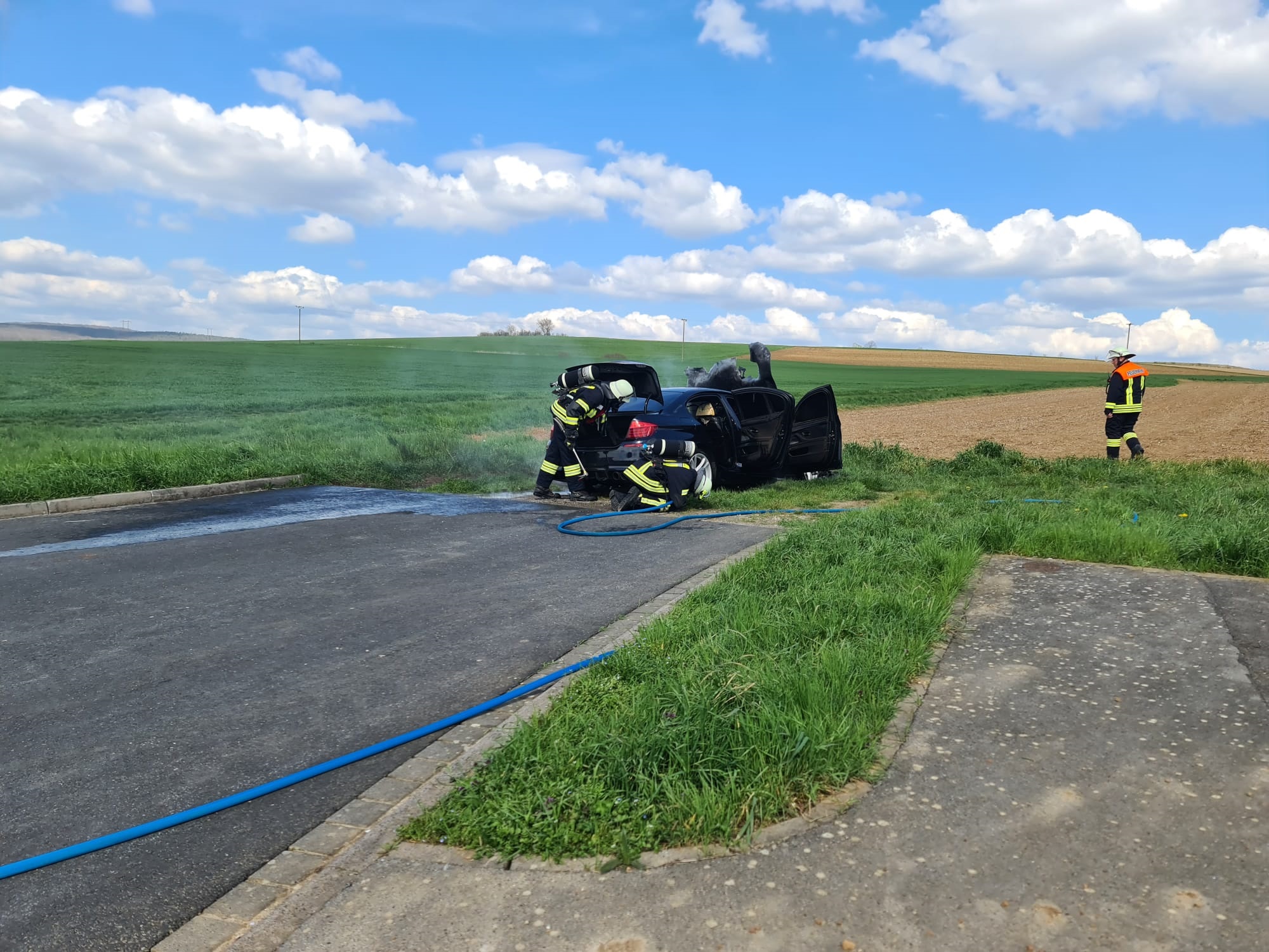 Der PKW stand bei unserer Ankunft bereits in Vollbrand. Wir löschten diesen unter Atemschutz per Schnellangriff.