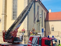 Eine Bürgerin teilte uns per Telefon mit, dass sie seit einiger Zeit Kratzgeräusche aus einer Dachrinne hört. Daraufhin mobilisierten wir eine kleine Mannschaft und erkundeten das Objekt mithilfe der Drehleiter.