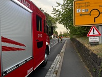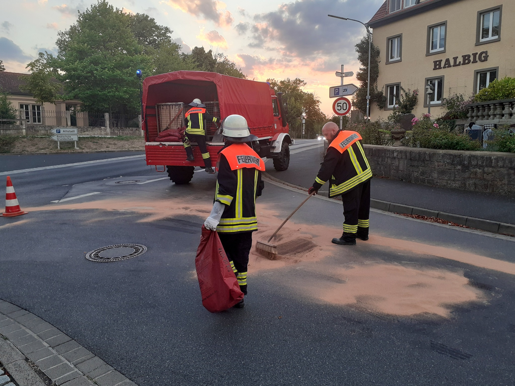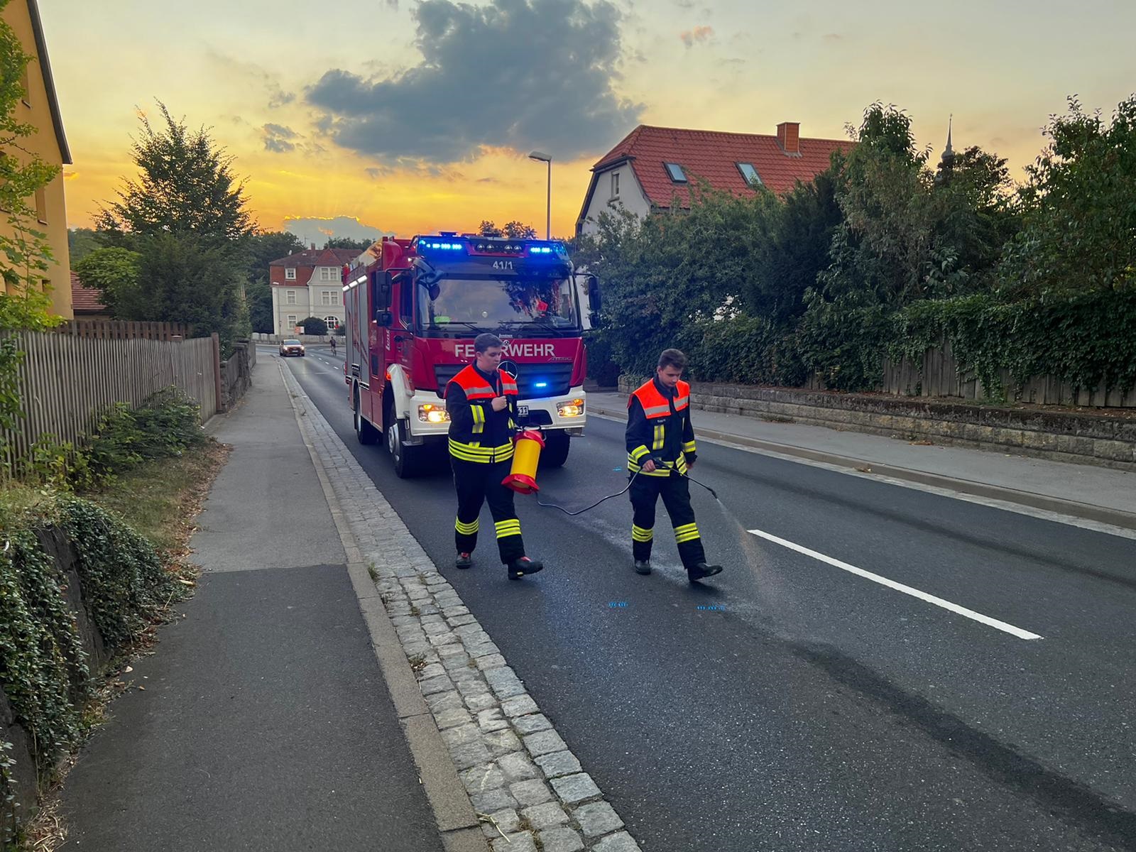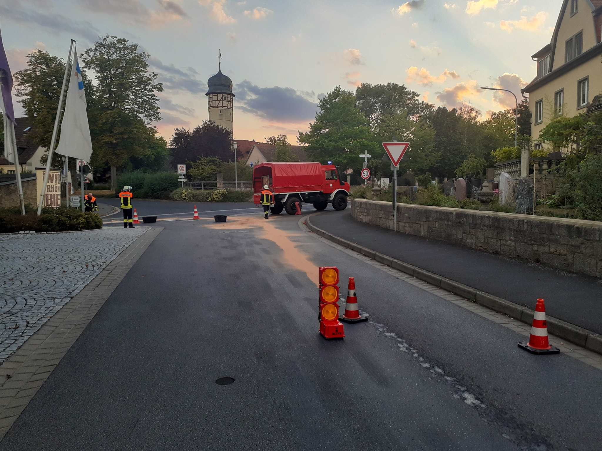 Auf einer Länge von ca. 2 Kilometern zog sich eine Kraftstoff-/Ölspur durch Mellrichstadt. Wir banden jene mittels Ölbindemittel und Bioversal und stellten Hinweisschilder auf.