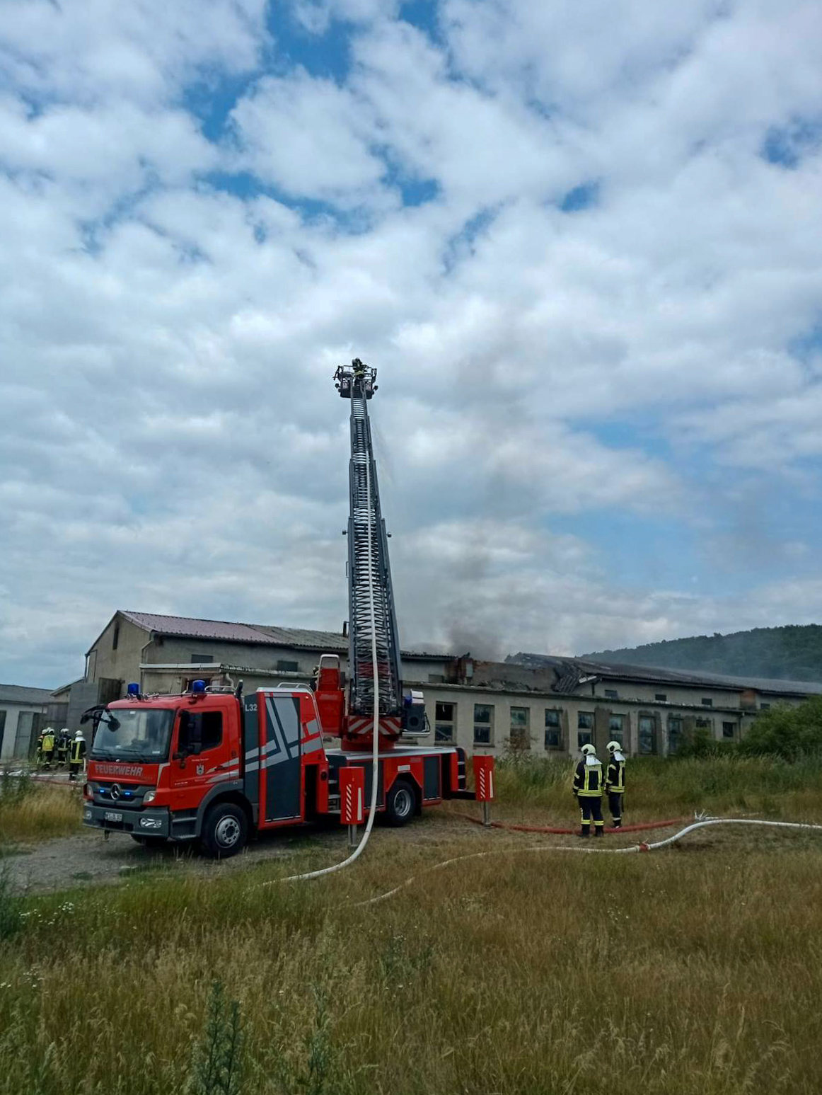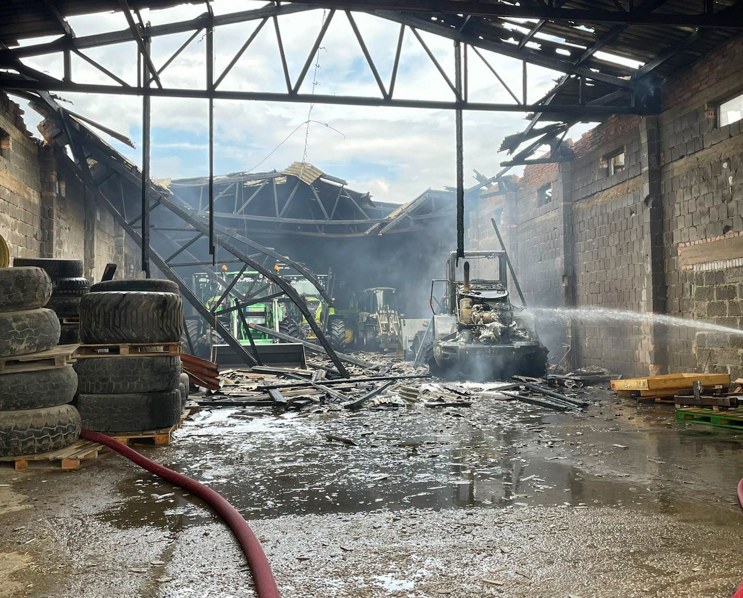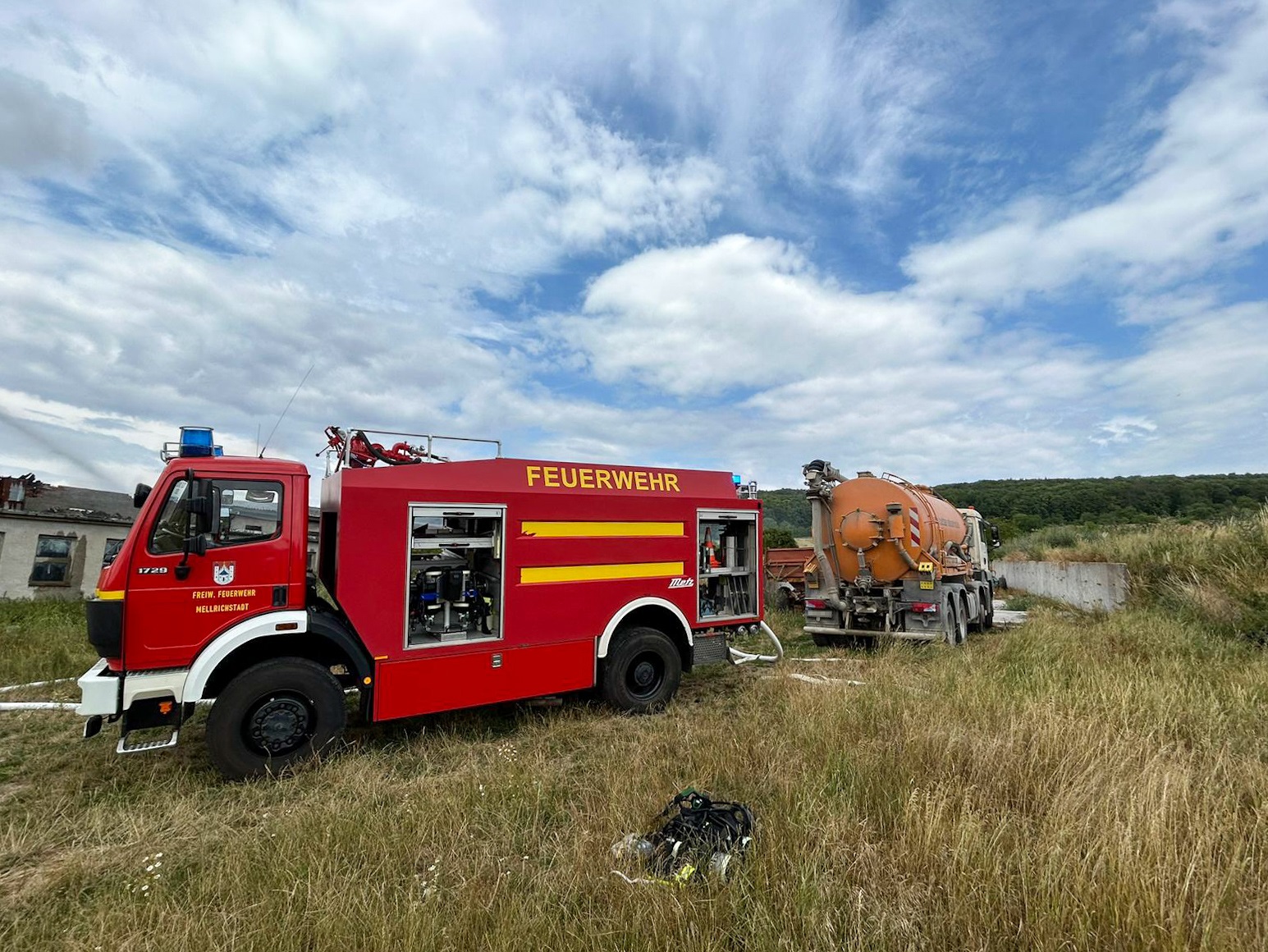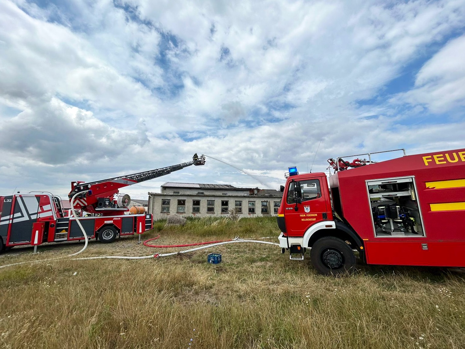 Bereits auf der Anfahrt war eine große Rauchsäule zu sehen. Eine Lagerhalle mit landwirtschaftlichen Maschinen stand in Flammen. Gemeinsam mit den Feuerwehren vor Ort bekämpften wir den Brand sowohl von Innen mit Atemschutzgeräteträgern, als auch von Außen über die Drehleiter. Die Wasserversorgung wurde durch einen Pendelverkehr mit landwirtschaftlichen Wasserfässern, sowie durch eine lange Schlauchleitung, kommend von einer Zisterne, sichergestellt. Am Ende des Einsatzes unterstützten wir die Kriminalpolizei noch per Drohne, Bilder des einsturzgefährdenden Objektes anzufertigen. Der Sachschaden beläuft sich auf ca. 200.000€.