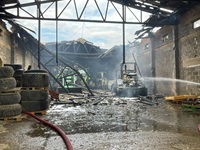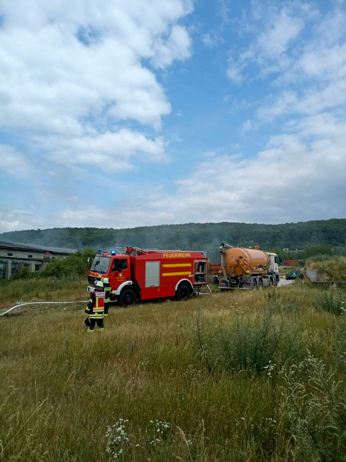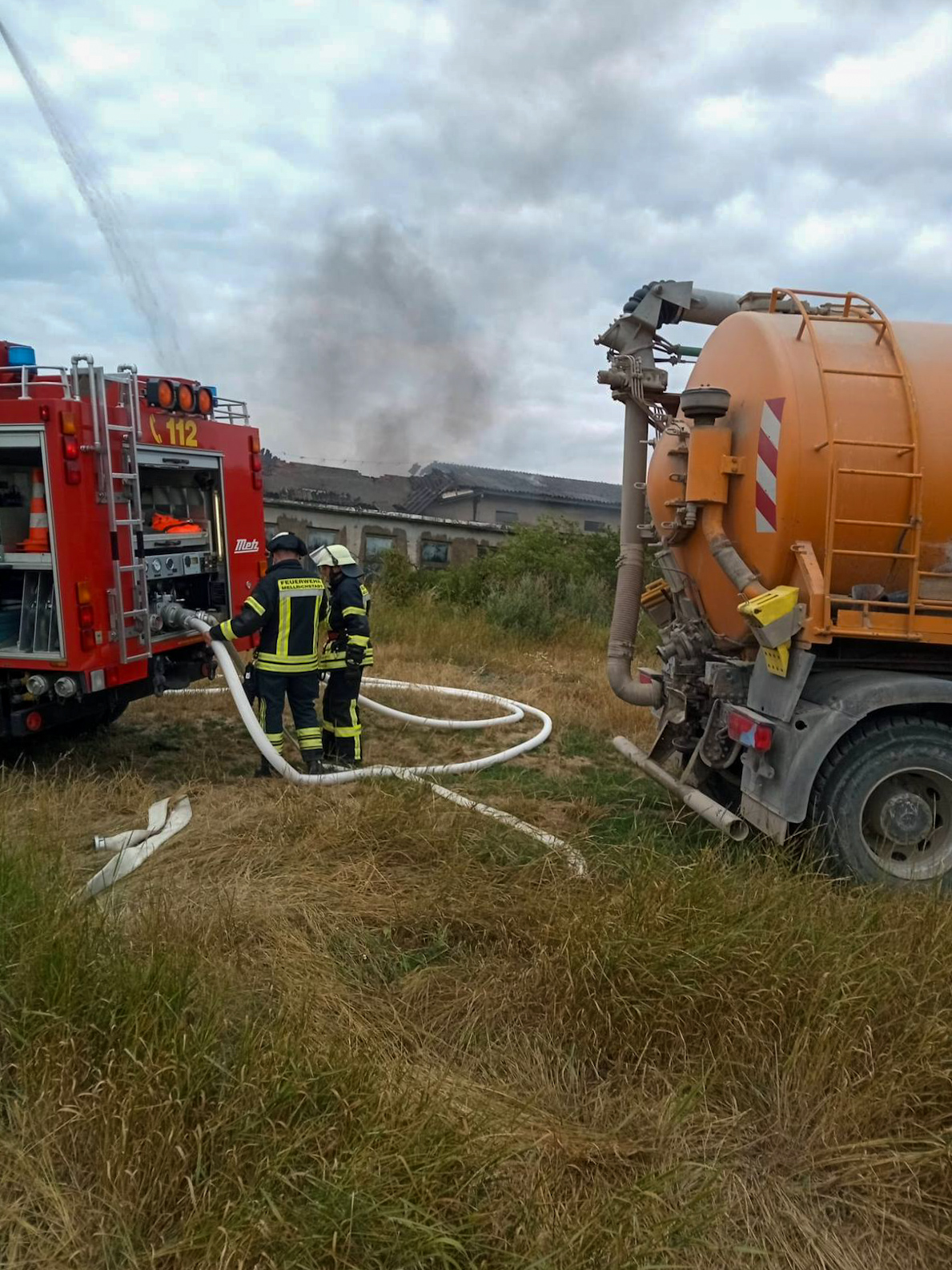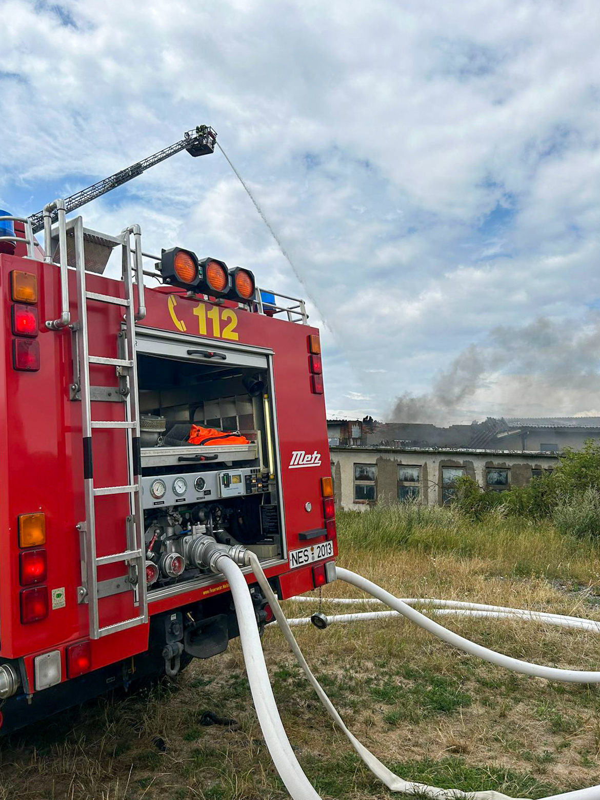 Bereits auf der Anfahrt war eine große Rauchsäule zu sehen. Eine Lagerhalle mit landwirtschaftlichen Maschinen stand in Flammen. Gemeinsam mit den Feuerwehren vor Ort bekämpften wir den Brand sowohl von Innen mit Atemschutzgeräteträgern, als auch von Außen über die Drehleiter. Die Wasserversorgung wurde durch einen Pendelverkehr mit landwirtschaftlichen Wasserfässern, sowie durch eine lange Schlauchleitung, kommend von einer Zisterne, sichergestellt. Am Ende des Einsatzes unterstützten wir die Kriminalpolizei noch per Drohne, Bilder des einsturzgefährdenden Objektes anzufertigen. Der Sachschaden beläuft sich auf ca. 200.000€.