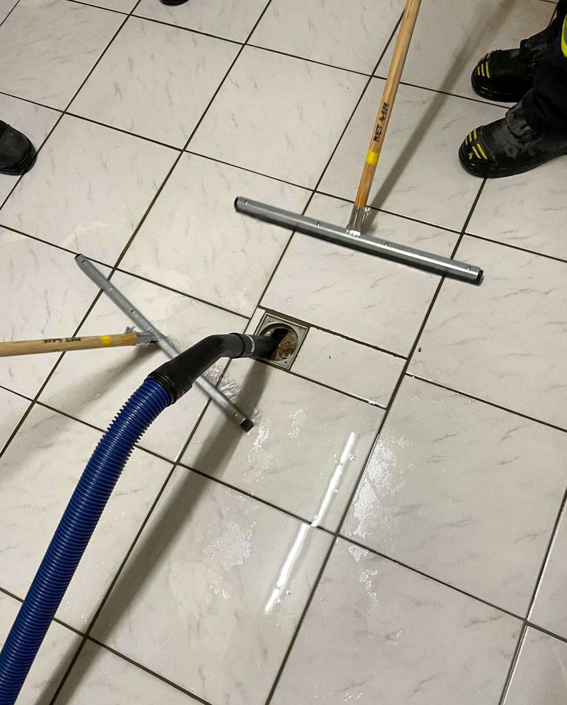 Durch einen Abfluss im Keller wurde Wasser zurück in die Wohnung gedrückt. Wir setzten einen Nasssauger ein und beförderten das Wasser, welches sich bereits in allen Kellerräumen ausgebreitet hatte, ins Freie.