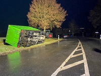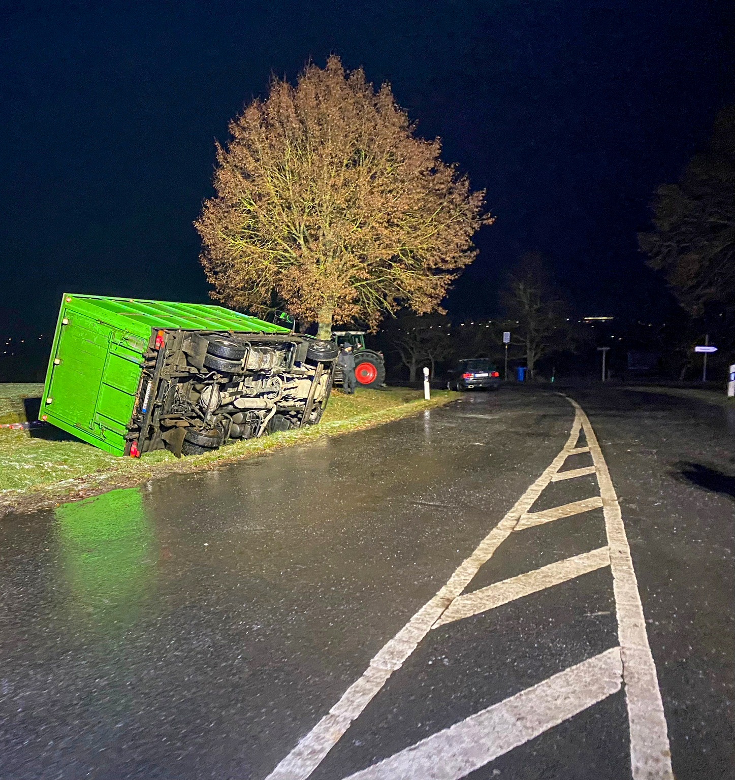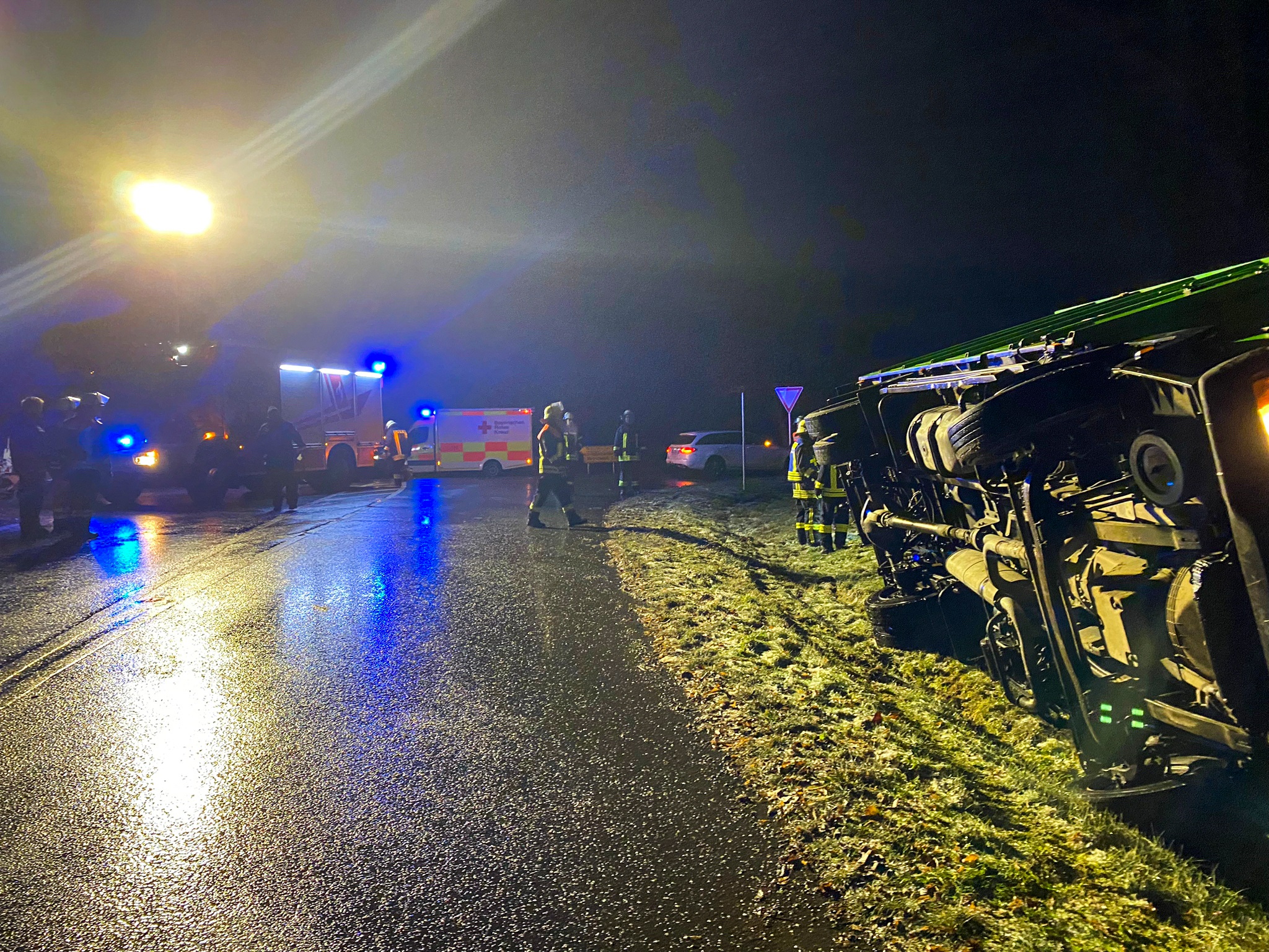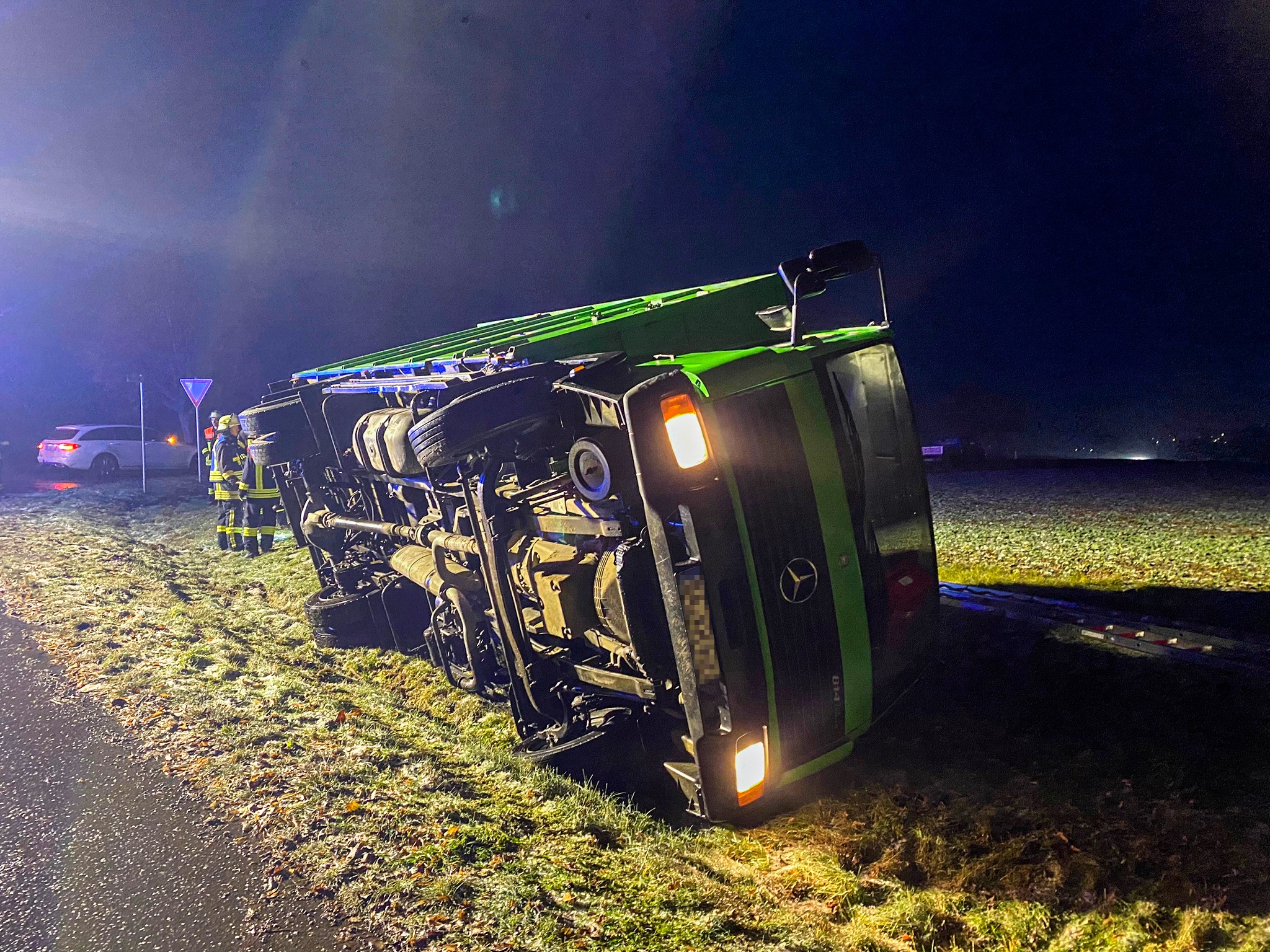 Aufgrund von Glatteis rutschte ein LKW in den Graben und stürzte um. Glücklicherweise blieb der Fahrer unverletzt. Wir konnten ihm per Leiter aus dem helfen und sicherten die Einsatzstelle beim Aufstellen des Fahrzeuges ab.