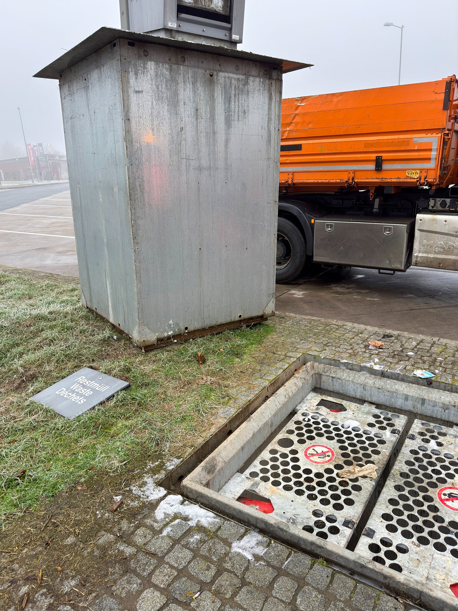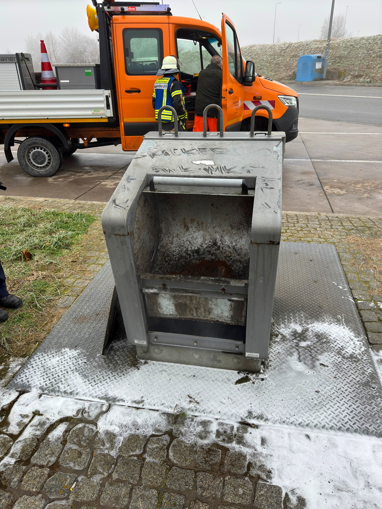 Wir wurden zur Raststätte Mellrichstädter Höhe auf der A71 alarmiert. Dort brannte ein unterirdischer Mülleimer. Wir löschten das Feuer durch die Öffnung. Da der Behälter nicht zugänglich war, hob ein Kran des Straßenbaulastträgers den Müllbehälter aus dem Boden.